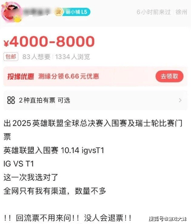 然而,在赛场尚未开打之前,另一场“争夺战”却已经提前打响——门票大战,官方定价388元的入围赛门票,短短几分钟就被抢购一空,更令人咋舌的是,黄牛的身影随即出现,二手票价格直接飙升至4000-8000元,翻了近20倍,原本一场全民狂欢的电竞盛宴,瞬间变成了少数人才能负担的“奢侈体验”。