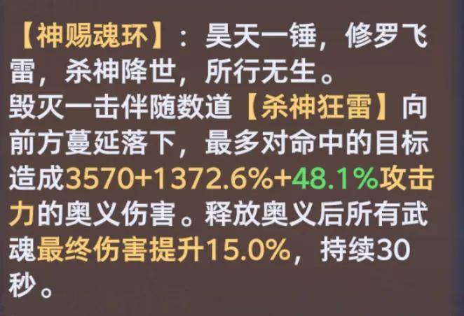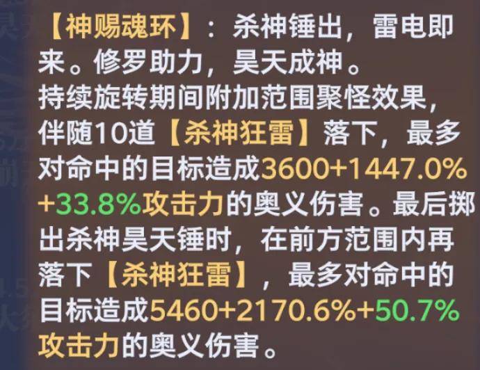 首先唐昊的神赐魂环在带到1技能猛兽系魂环上时,其最大的意义就是提供多个“杀神狂雷”的输出,这点倒是和之前锤三那个神赐魂环放到1技能奥义上的作用类似。