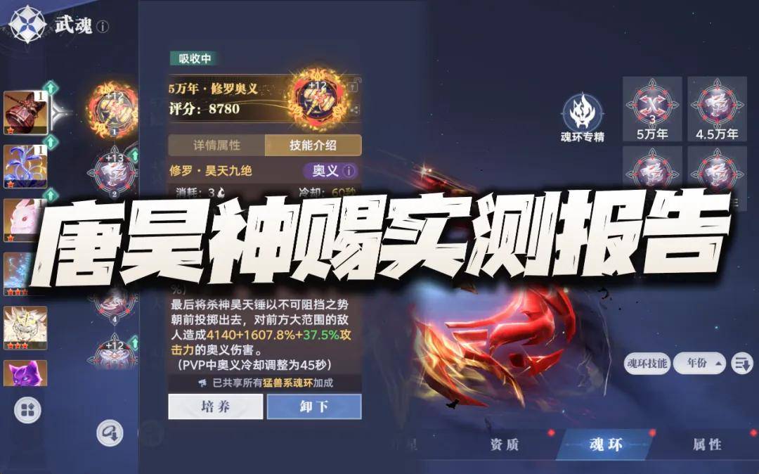 今天的攻略咱们来把唐昊的神赐魂环实测报告给做了,因为唐昊目前是一位极具争议的新限定主C,很多朋友在经过了两天多的洗礼后依然在思考是否需要培养或者是抽取唐昊,所以今天维一就为大家呈现一下唐昊的神赐魂环到底具备多强的增伤能力,且在没有和有神赐的不同环境下,唐昊的强度差距又到底有多大。