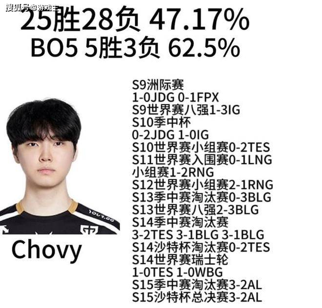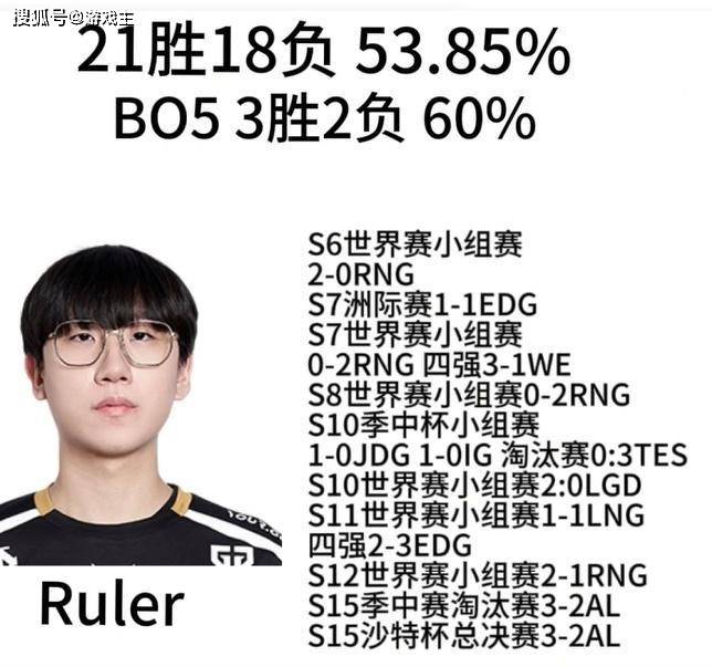 紧接着就是大家非常熟悉的chovy,他的小场总胜率为47.17%,25胜28负,BO5的胜率是62.5%,五场胜利三场失败。他是在S9赛季之后才和lpl赛区有了交手,所以场次并没有那么的多。大家比较熟悉的ruler场次也不是很多,整个的胜率是53.85%,21胜18负。BO 5一共打了五场,胜率60%。尺帝之所以这么少,是因为之前在lpl赛区打过一段时间的比赛,中间空白了几年,不然的话场次应该会更多。