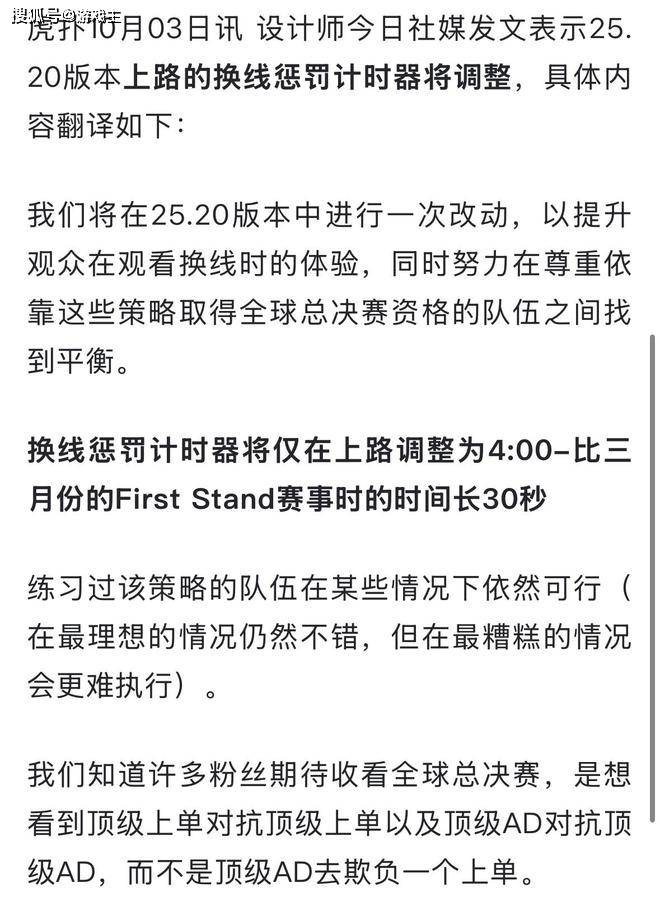 大家好,S15赛季的比赛已经正式开始了,相信绝大多数的玩家都关注了最近一段时间的对抗,各大赛区的比赛都进入到了一小段时间的休赛期,现在大家的焦点都聚集到了全球总决赛。随着比赛的逐渐临近,官方也是不断宣布比赛版本的多个调整,英雄削弱之后,整个的比赛阵容肯定会有很大的变动,而且官方的设计师还宣布了上路换线惩罚计时调整,再一次延长了换线的惩罚时间,这对于lpl赛区的al战队来说,无疑是毁灭的打击,毕竟他们能够在第二赛段拿到冠军,主要依靠的就是换线的套路。对于T1,Gen,blg来说,应该是好事。