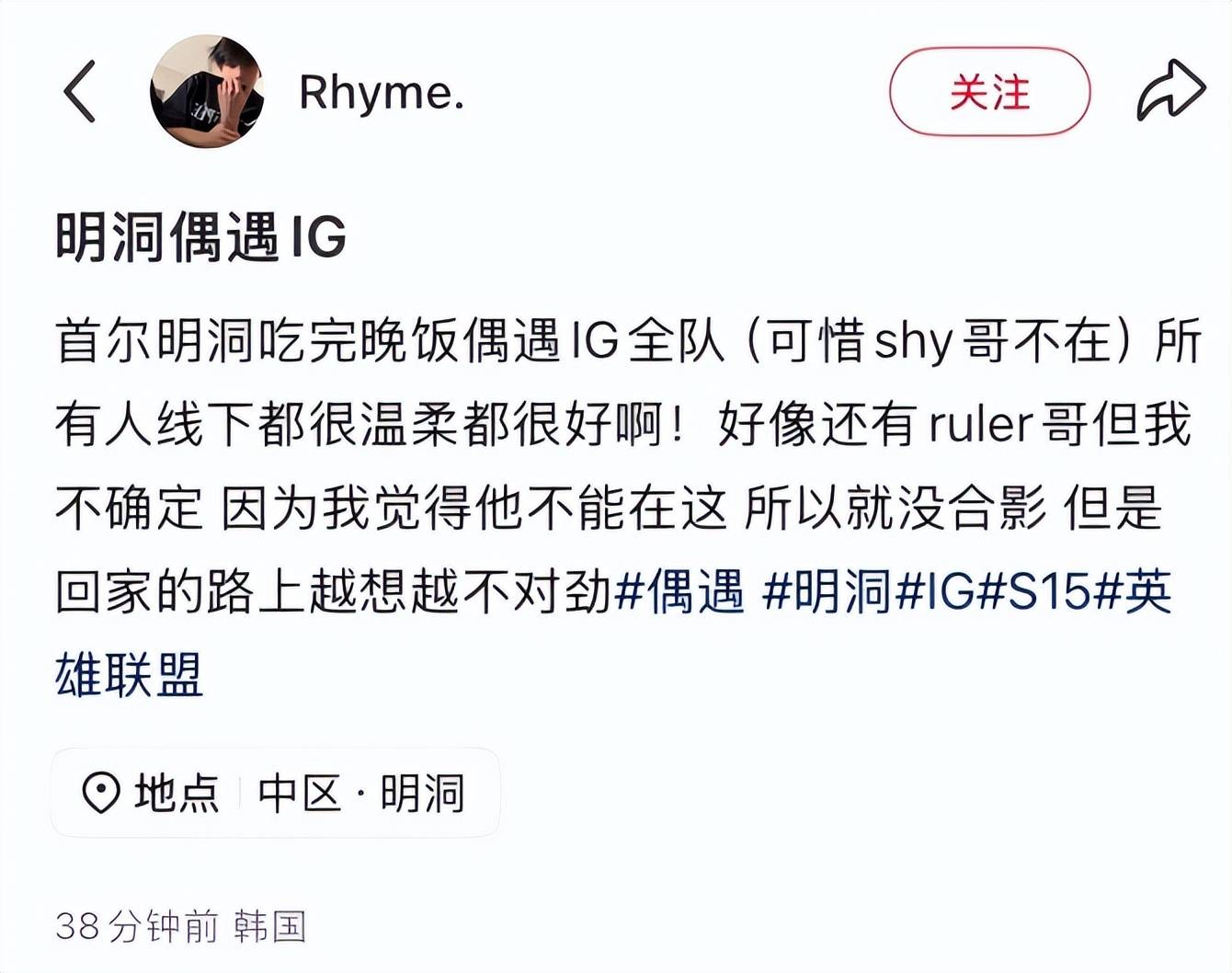 事后,这位网友越想越不对劲,虽说Ruler在LPL期间确实跟各大战队的选手混得比较熟,但大晚上出来跟IG全队出来聚餐这个事情,基本就是在明示他的时间安排跟IG众人的行程重合。并且在入围赛马上要开打的这个时间节点上,IG全员不去Rank上分,跑去韩国线下聚餐,九成九也是在搞线下集训。