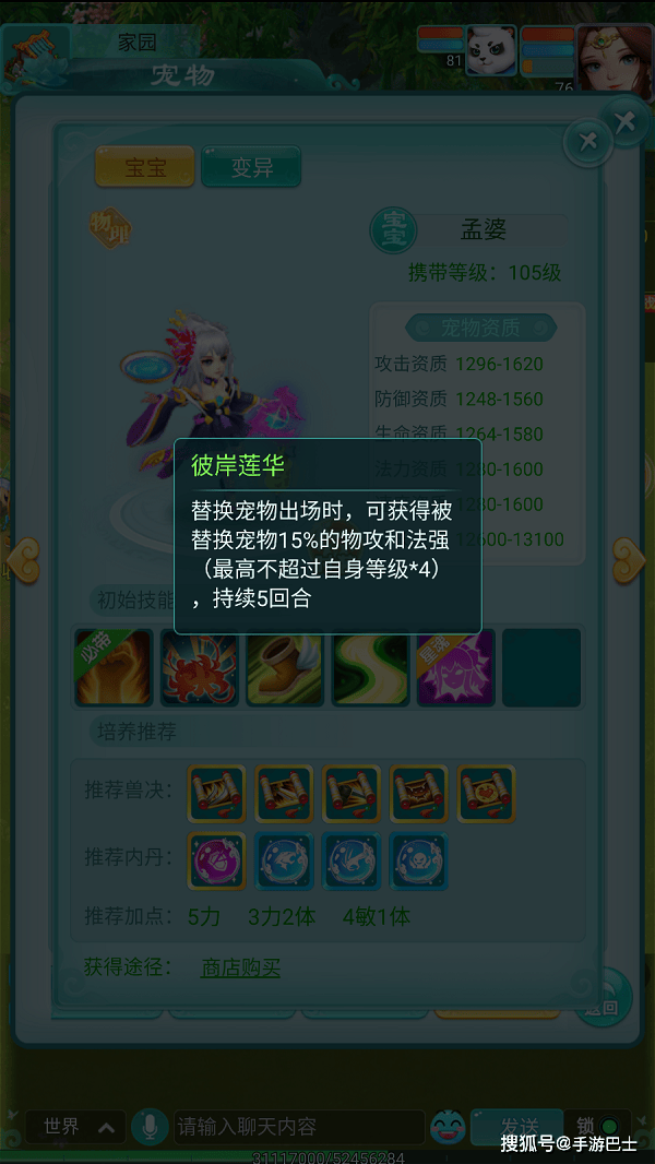 如果你打算专门培养这类频繁上下场的爆发型宠物,还可以考虑搭配特殊技能“彼岸莲华”。该技能能让替换上场的宠物继承被换下宠物15%的物攻或法强,再配合“气势”或“充能”,出场即可形成碾压之势,轻松打乱对手节奏。
