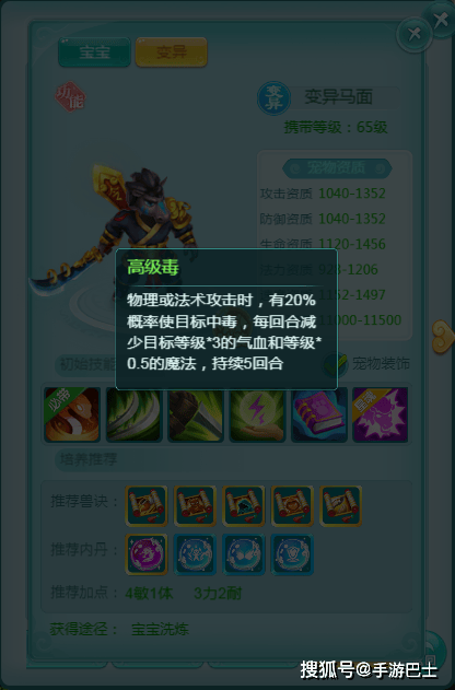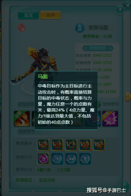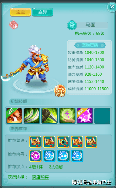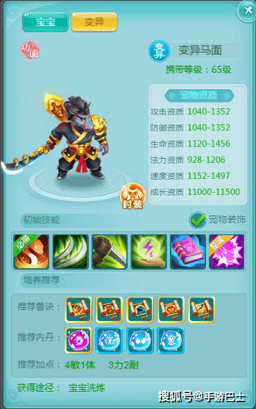 马面的攻击资质不算高,法力资质更低,不过生命、速度资质还可以,说明适合培养成肉宠。给马面佩戴上装饰后,背后会多出来一个令牌,那是阎罗王亲自授予的,看起来更威严啦。