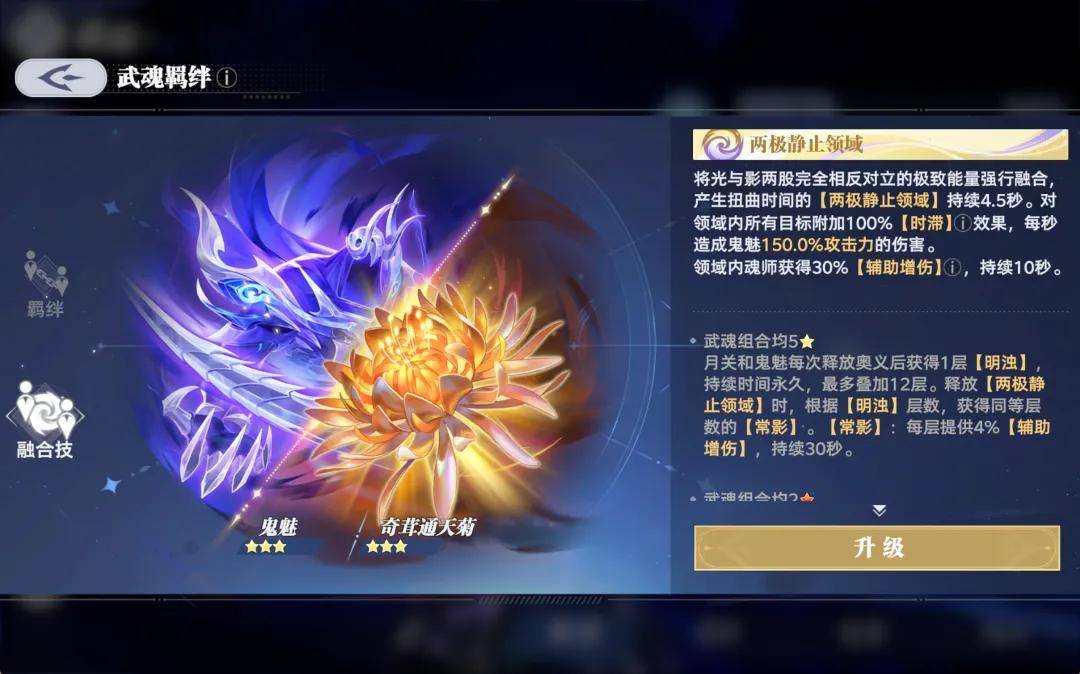最后则是鬼魅/菊花的武魂融合技,这个技能目前的泛用性那就更微弱了......不过其效果倒是颇为奇特,除了基础的限制对方移动等效果,此次改版后新增的“辅助增伤”数值也还算可观,最高可以达到30%持续10秒的辅助增伤+48%持续60秒的辅助增伤,不过其中这个48%持续60秒的增伤是需要一定时间暖机的,且鬼魅/菊花都没有达到红色4星时也只有30秒的冷却时间,同时考虑到鬼魅和月关目前的泛用性都只算一般,特别鬼魅的泛用性还要更低不少,所以这个武魂融合技目前就更是无人问津的地步了。