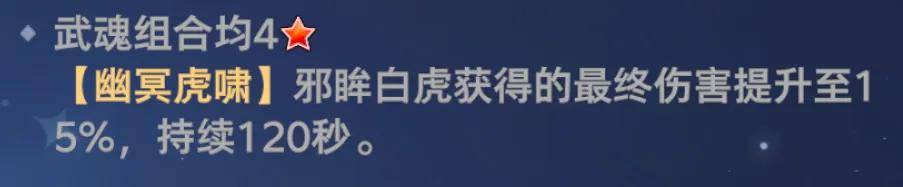 其中例如大家使用最多的戴沐白/朱竹清的武魂融合技,基础状态下依然是变身输出+持续增伤的能力,这点和原本的基础效果也是一致的,而当戴沐白和朱竹清都提升到黄色5星后其便可以新增武魂融合技攻击时对敌人额外附加“裂伤”的效果,不过说实话这个效果聊胜于无,经过实测伤害变化几乎没有......