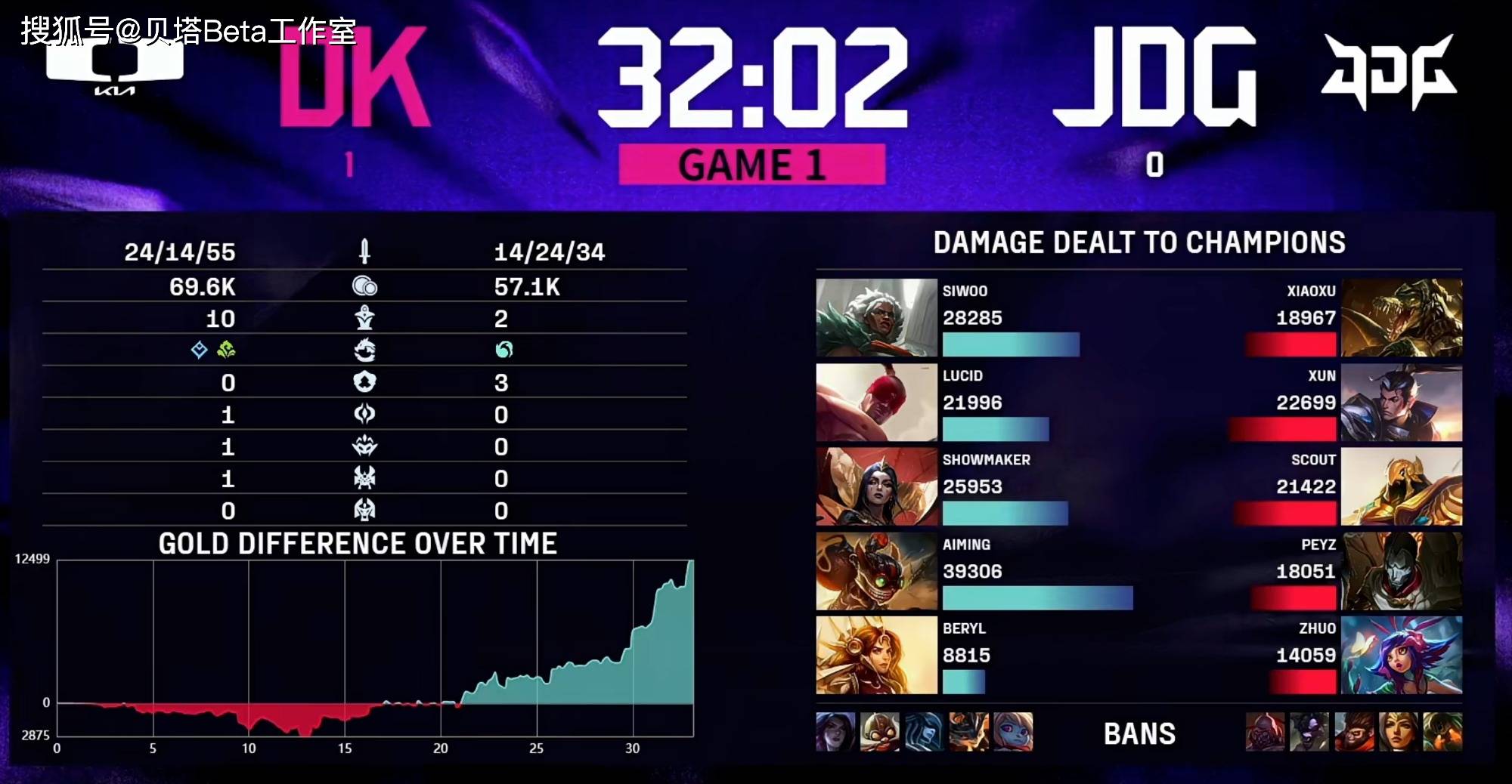 第一局DK上单安蓓萨,打野盲僧,中单妖姬,下路炸弹人加女坦;JDG上单鳄鱼,打野赵信,中单沙皇,下路烬加妮蔻。对线期下路3V3,Lucid盲僧击杀Peyz烬,Aiming炸弹人拿到了一血。之后JDG节奏不错,巢虫团打出0换2,野区又打出0换2,Peyz烬推掉了下路一血塔,前期JDG经济领先2K。