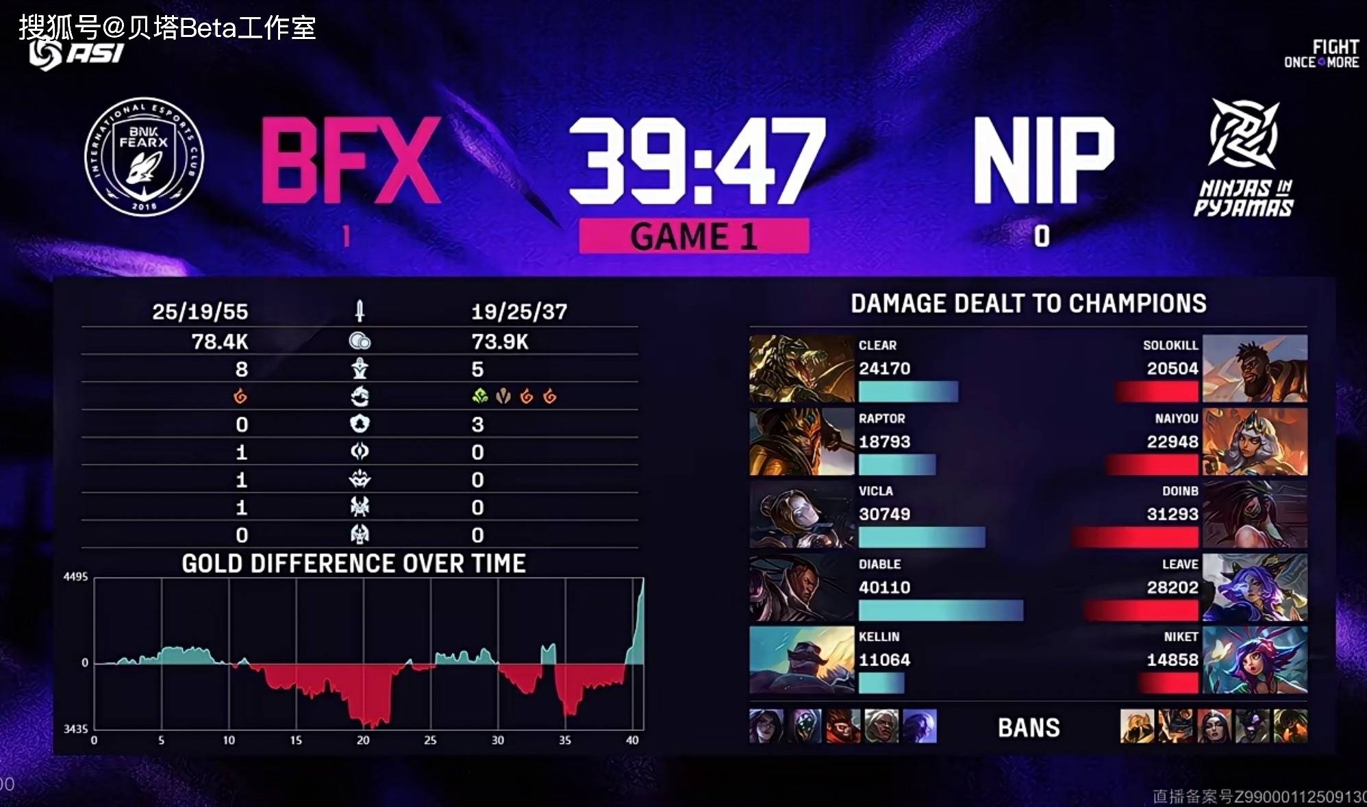 中期双方混战,BFX皇子拉扯成功,配合队友击杀leave芸阿娜,之后BFX主动打厄塔汗,doinb阿卡丽进场切死FPX皇子,naiyou琪亚娜失误,FPX反打打出1换4后,拿下厄塔汗。22分钟NIP拿下听牌龙。后期31分钟BFX在野区抓死NIP上辅2人后,拿下第一条大龙。33分钟双方争夺小龙,Niket妮蔻绕后R多人,NIP打出0换3后,拿下火龙魂。38分钟双方野区混战,Niket妮蔻绕后被抓,Leave芸阿娜被秒,BFX卢锡安豪取3杀,直接一波推平基地。首局伤害最高的Diable卢锡安,NIP这边伤害最高的是doinb阿卡丽。