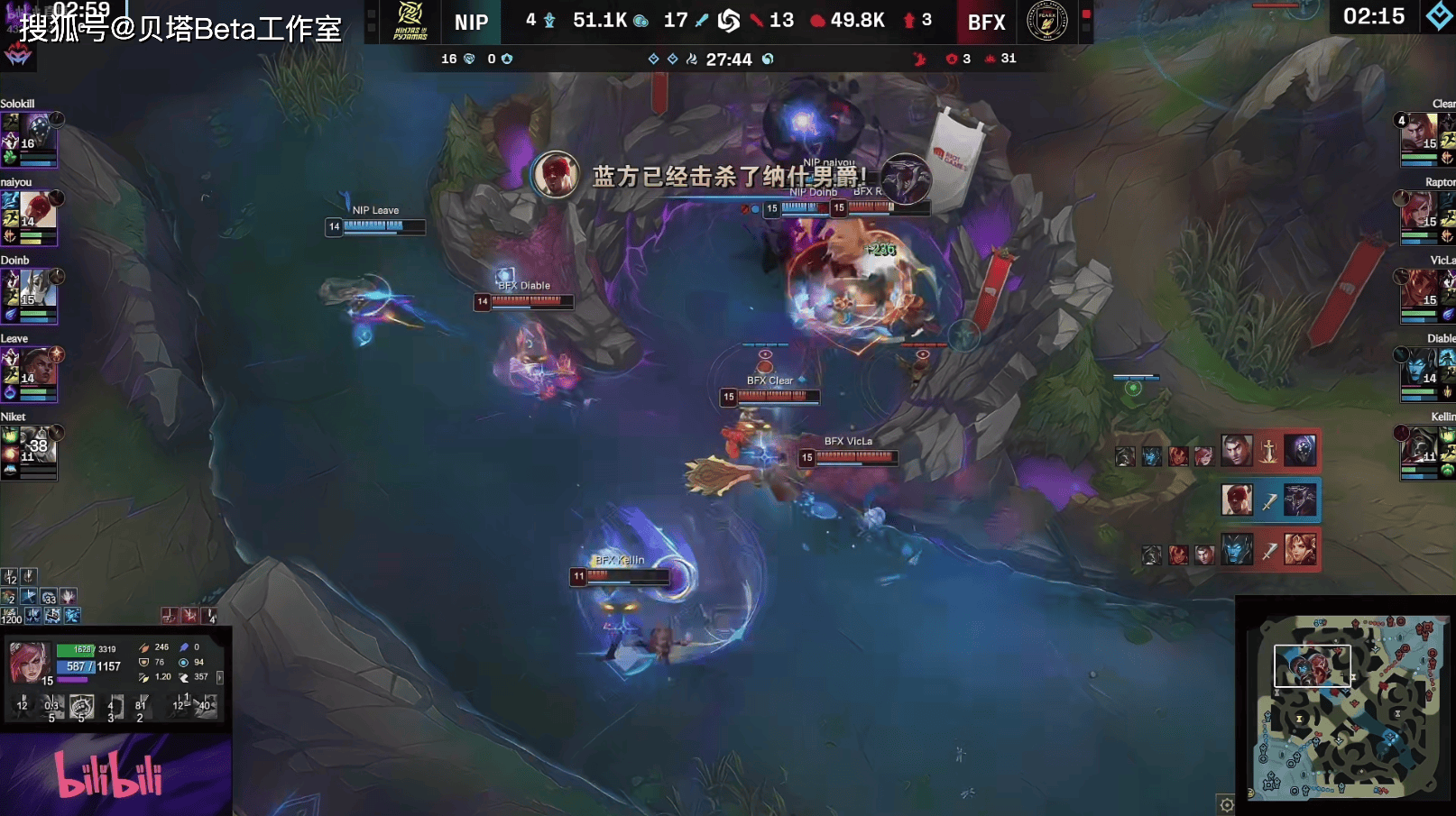 中期NIP下路双人组又被击杀,BFX拿下厄塔汗。24分钟双方下路混战,NIP利用人多打人少5V4打出0换4后,拿下听牌龙。27分钟NIP主动打大龙,虽然naiyou盲僧拿下第一条大龙,但是因为打龙太慢,BFX赶来堵住龙坑打出完美团,一波0换5团灭NIP后,拿下第二局的胜利。