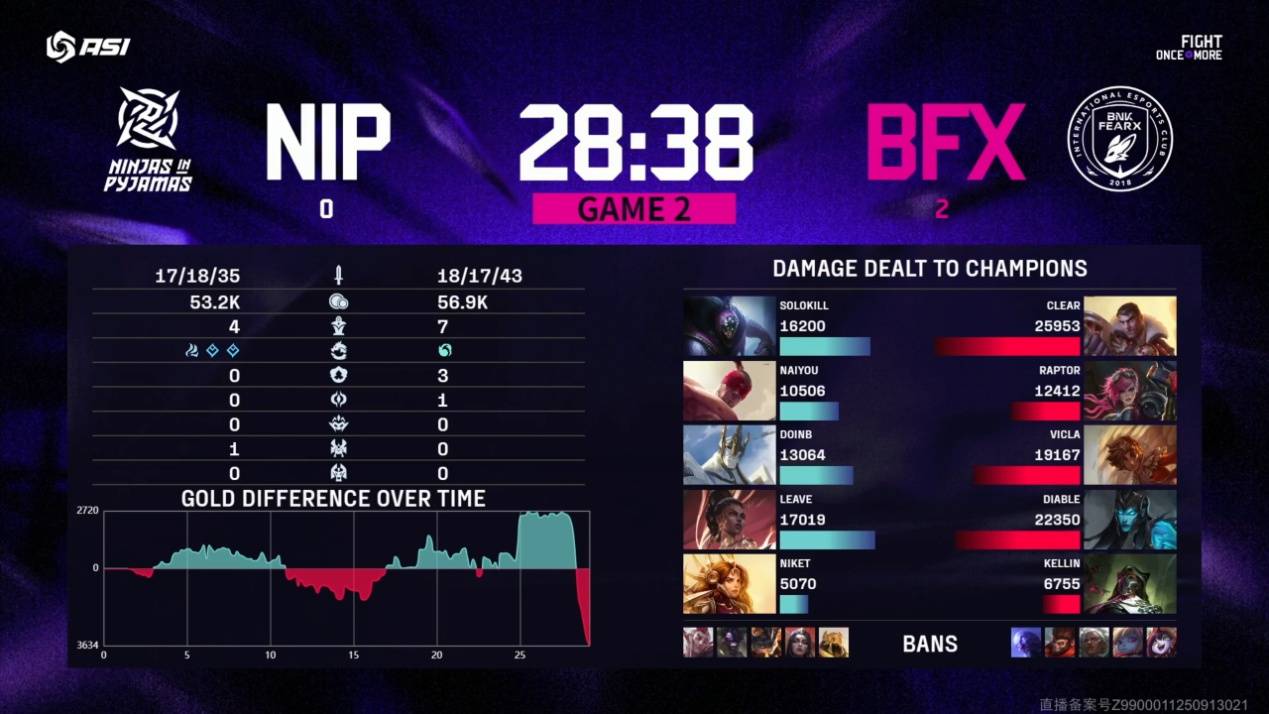 但进入后期之后BFX是抓住机会撕开口子打出减员后拿下大龙,NIP在这样的局面下还打出完美开团拿下火龙魂,然而最终还是被BFX带走。
