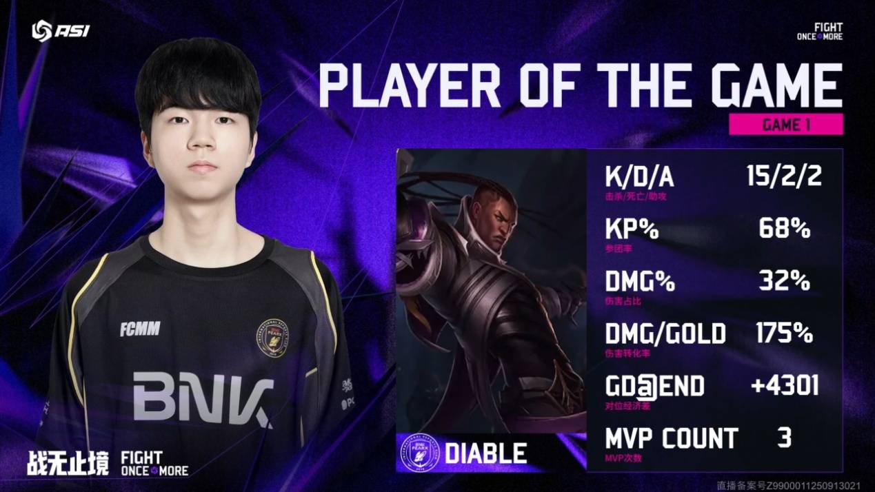 本局比赛BFX下路选手Diable卢锡安全场砍下15-2的豪华战绩。