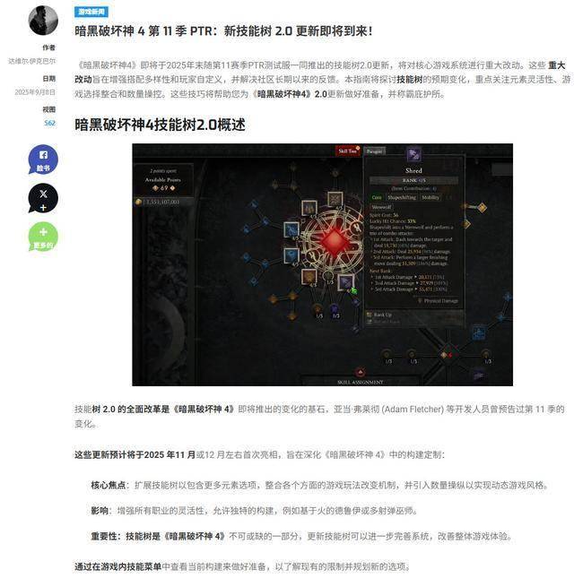 技能树2.0是《暗黑破坏神4》第11赛季的核心更新之一,由开发者Adam Fletcher等人提前预告,预计于2025年11月至12月左右上线,这次更新将深度强化游戏的Build自定义系统: