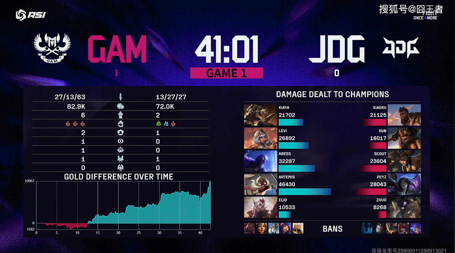 结果第一局比赛,JDG仅在开头阶段,打出1500经济的好局,后期就被GAM接管了比赛。比赛前期JDG一度打出优势,但GAM迅速扭转局面。比赛第20分钟,两队在中路爆发激战,Levi奇亚娜三杀帮助GAM拉开经济差拿下厄塔汗;比赛第28分钟左右,GAM野区打出1换4后拿下大龙,将经济差距拉开到7000;比赛第30分钟左右,两队在中路爆发团战,Scout蛇女在Xiaoxu奎桑提帮助下拿下三杀,JDG打出3换3;比赛第35分钟左右,JDG抱团rush掉大龙但GAM打出2换4;最终比赛第41分01秒,GAM龙魂团0换3,后结束比赛。