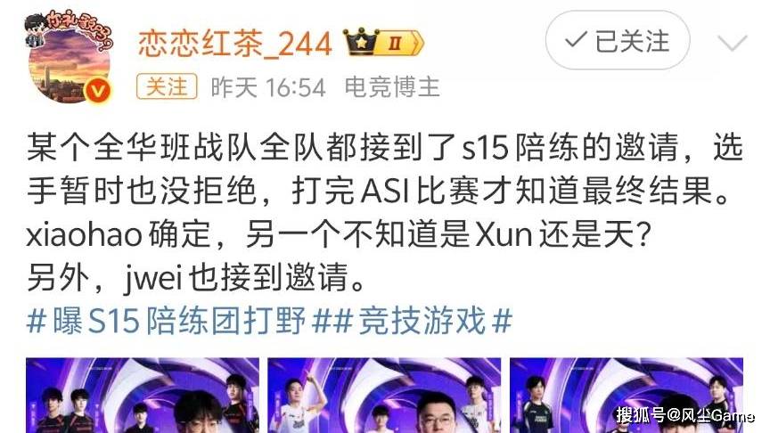 WBG邀请赛打进淘汰赛之后,爆料博主红茶发文透露:全华班全队都收到了,S15世界赛陪练的邀请,选手们没有拒绝,但最终结果,得打完邀请赛才知道,虽然没有点名WBG,但红茶的配图,是参加邀请赛的三支队伍,这三队里,只有WBG是全华班,所以小虎可能也要去参加陪练。