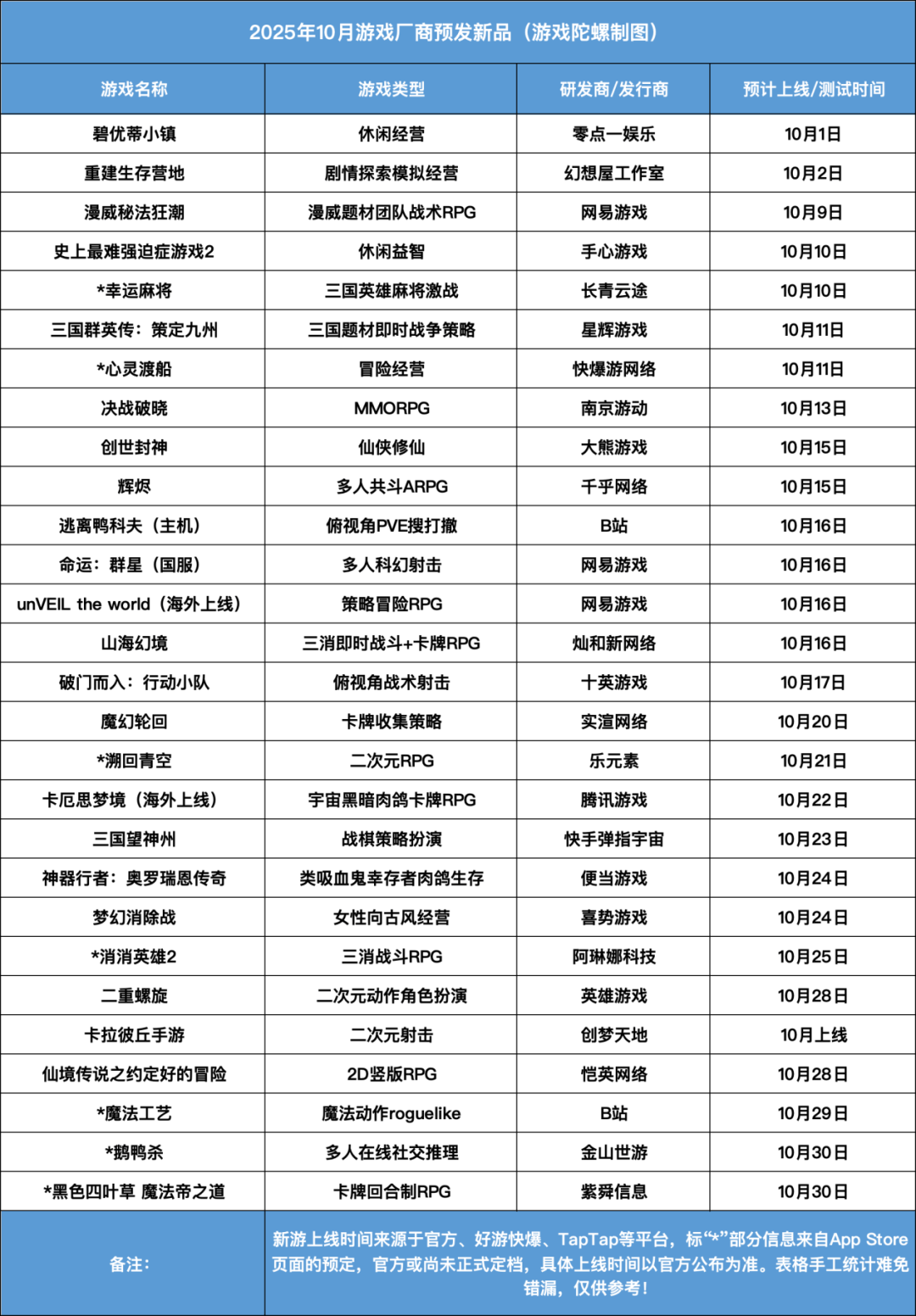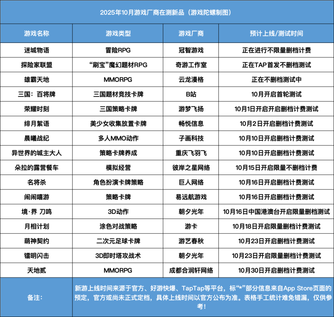 除了已定档的游戏,陀螺君也统计10月正在测试或将开启限量测试的新游,共计16款。