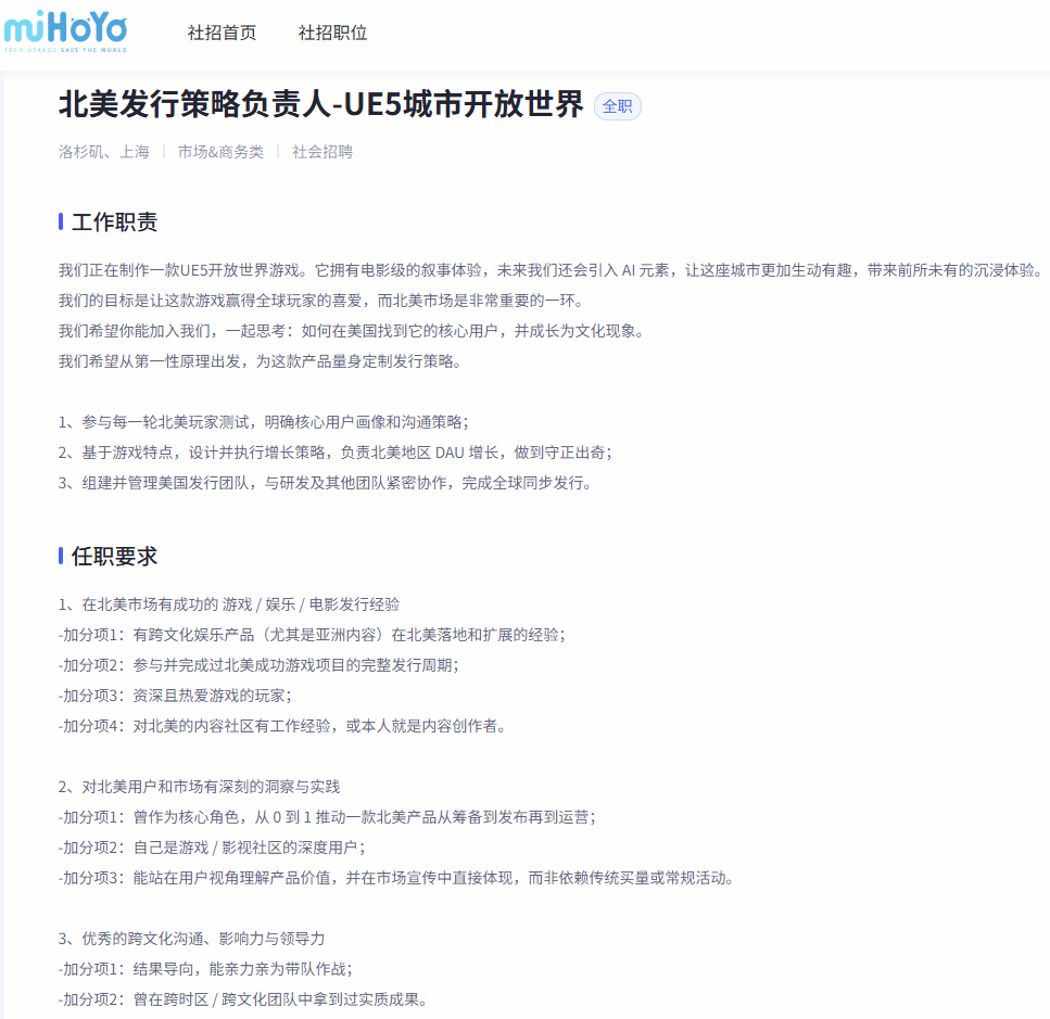 10月2日,米哈游官网招聘信息首次披露,正打造一款基于虚幻引擎5的“城市开放世界”游戏,强调电影级叙事与AI驱动的动态环境。职位要求聚焦北美发行、用户增长及全球同步上线,猜测项目已进入中后期。