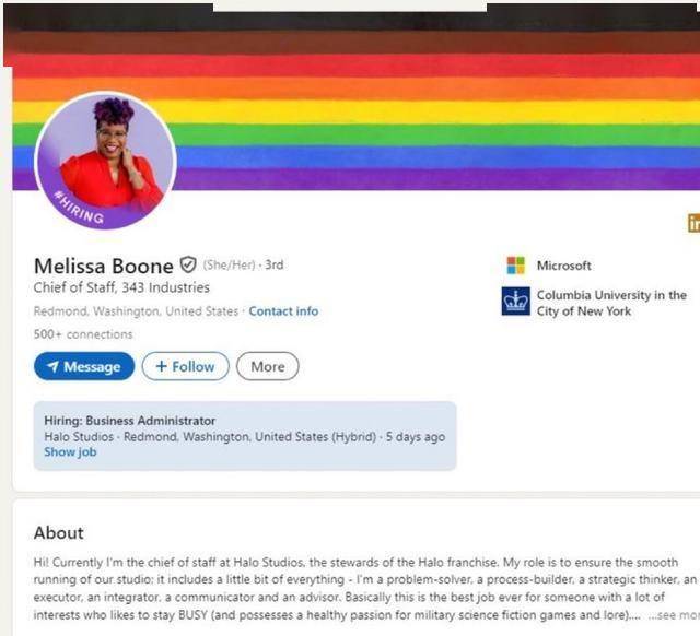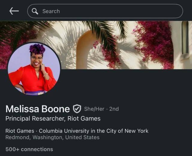 近日,国外玩家发现《光环》工作室女黑人主管(Chief of Staff,幕僚长)Melissa Boone已经离开,加盟了拳头游戏担任首席研究员。