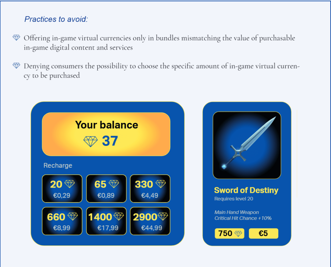 比如指引在开头就将游戏内虚拟货币界定为「以现实货币购买,然后在游戏中用于支付数字内容/服务的那种虚拟货币」,且指出「交易通过游戏内货币支付数字内容/服务,也要受到欧洲消费者保护法律约束,就像使用现实货币购买时一样」;用户使用游戏币支付时,商品/内容要显示对应的现实货币价格;用户应有在一定期限 (如14天内)撤销/退用未使用的游戏币/内容的权利;禁止引诱用户购买更多货币,或以限定捆绑包的形式逼迫用户购买自己不想要的额外内容……