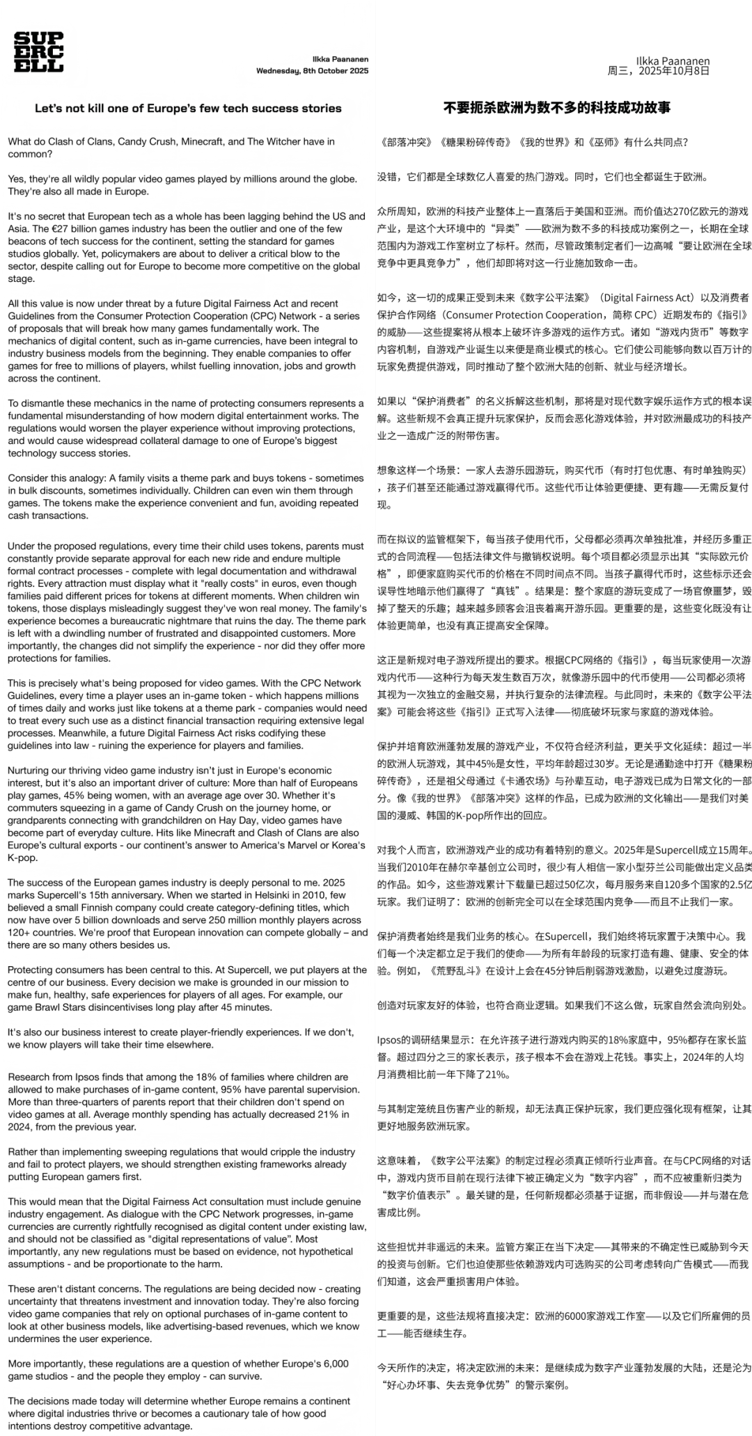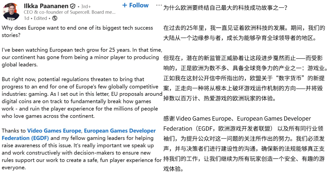 10月8日,Supercell CEO Ilkka Paananen,在LinkedIn上发帖,对欧盟委员会正处于征询期的DFA (Digital Fairness Act,数字公平法案)、CPC指引 (Consumer Protection Cooperation消费者保护合作网络发布的指引)中关于数字货币的提案,表示质疑。