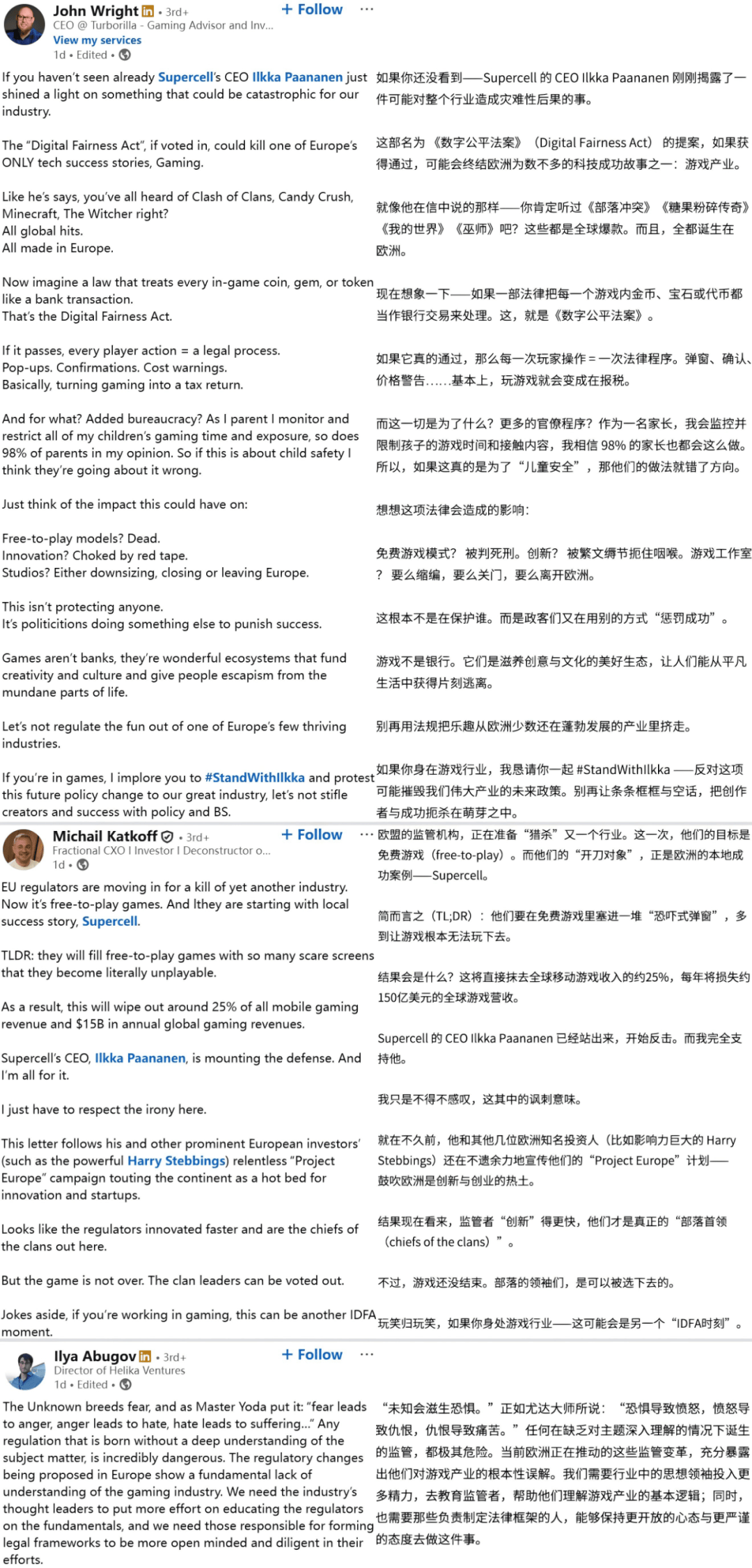 不少业内人士,包括Turborilla (瑞典游戏公司)CEO John Wright、Helika Ventures (面向游戏行业提供支持服务的公司)的董事Ilya Abugov、海外游戏媒体DoF (Deconstructor of Fun)创始人Michail Katkoff等,也都发帖声援Ilkka。