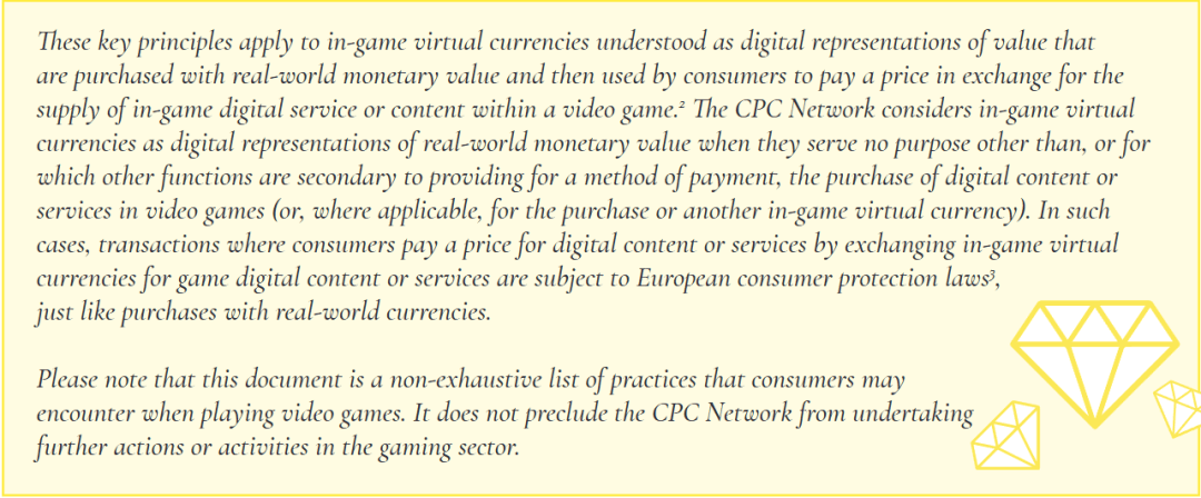 到了今年3月,CPC网络 (消费者保护合作网络)联同欧盟委员会,发布了一套「游戏内虚拟货币关键原则」 (Key Principles on In-Game Virtual Currencies),也就是我们在前文提到的CPC指引。外网讨论认为,CPC指引中的不少措辞,都在将游戏内货币和数字价值、金融交易、合同行为挂钩。