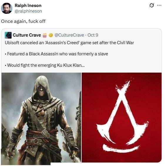 此举引发玩家群体强烈不满。许多人既因育碧疑似向种族主义者妥协而愤慨,又为这个充满潜力的题材被弃用感到失望——这似乎成了育碧讨好反对派的手段。更值得注意的是,业界人士也加入了批评行列——一位曾参演《刺客信条》系列的演员就此发声。