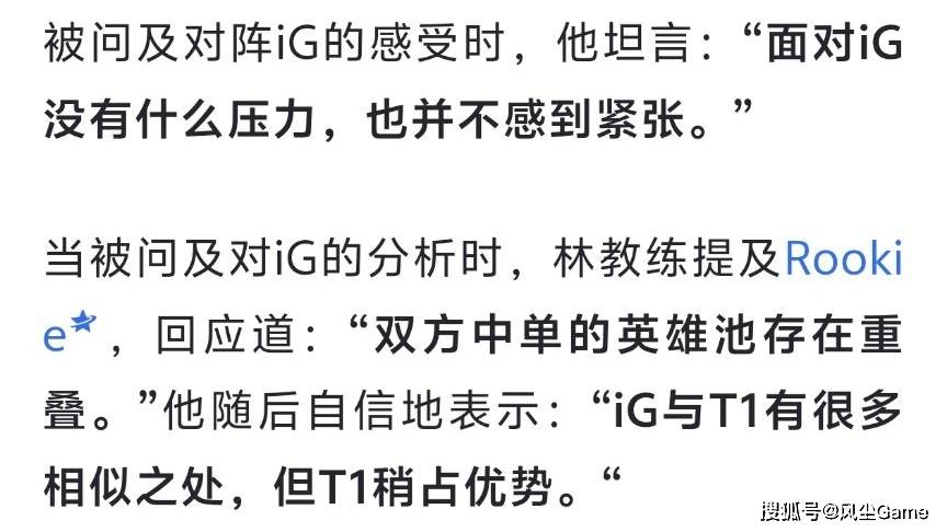 被问到对战IG的感受时,Tom放话:面对IG没什么压力,也并不感到紧张,虽然都是四号种子,但T1打IG,说实话确实压力不大,这支队伍世界赛的发挥,已经经过很多次验证了,而IG除了AD比较稳定之外,剩下的选手们,状态怎么样谁都不知道,尤其是Rookie,冒泡赛一直都很低迷。