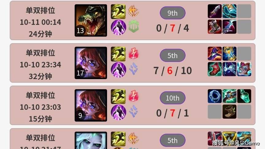 今年全球总决赛,是在本土举办,所以参赛选手们,最近都在峡谷之巅训练,BLG上单Bin,最近的排位战绩很“亮眼”,10号到11号,Bin哥一共打了10把排位,只赢了三局,其中一局阿罗拉,被路人完爆,玩鳄鱼的那一局,又遇到FNC上野,被对面无限针对,这两把Bin哥都被打成了0-7。