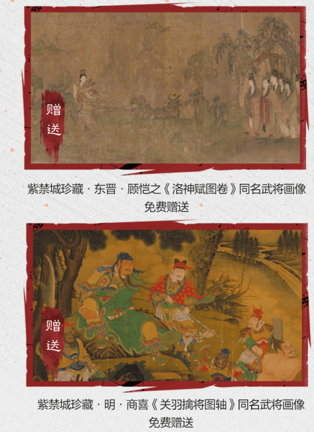 紫禁城里备受瞩目的 “紫禁城珍藏”藏品,《洛神赋图》化作甄洛衣袂流光,《关羽擒将图》凝为关羽刀光。将化作游戏内同名武将画像,免费赠送全体玩家!这一次,深藏于故宫的文化珍藏,以数字化的形式,来到游戏“再就业”。走进千万年轻人囊中,至此,我们已不是单纯的游戏玩家,更是国宝的当代守护人。