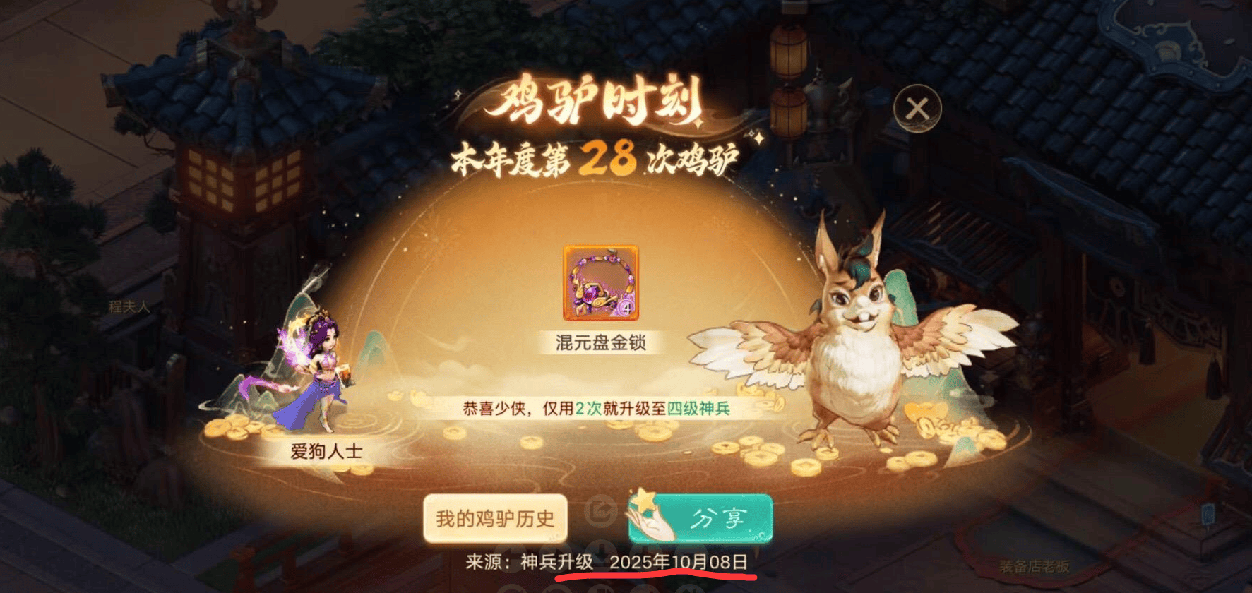 ⑥升级神兵:当玩家以较少的次数成功升级3-6级神兵时,系统会通过全服公告和跑马灯形式展示“鸡驴时刻”,并标注幸运玩家的昵称。