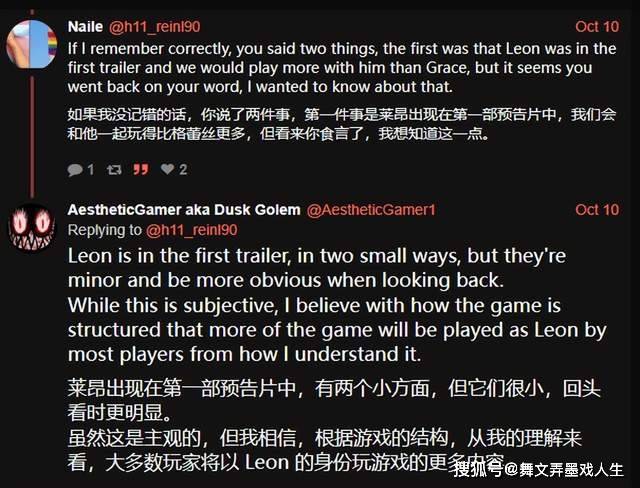 可惜从Aesthetic Gamer的发言上来看,无论是里昂会成为可操作角色在游戏中正式登场,还是有两个细节证明他已经在游戏的首支预告片中出现,都是Aesthetic Gamer的主观理解。并且,本次的发言中,Aesthetic Gamer也没有详细介绍里昂出现在《生化危机9:安魂曲》首支预告片中的细节。他笃定的说法,自然让人产生了更多质疑。毕竟,若是里昂真的有在首支预告片中出现,无论再怎么细节,也不应该全网玩家都没有注意。
