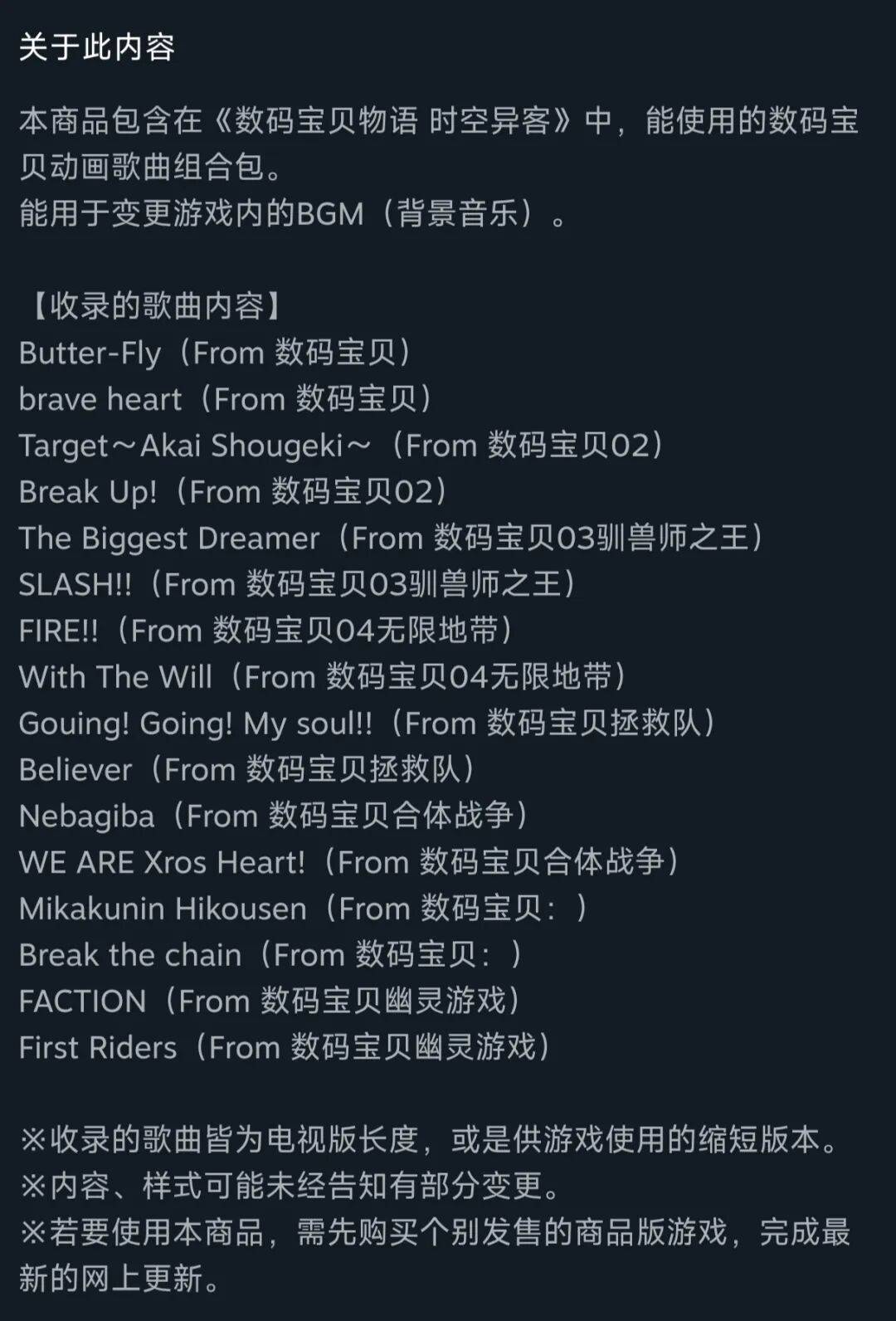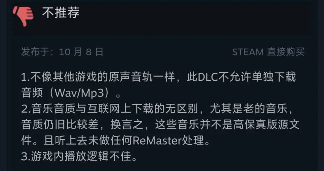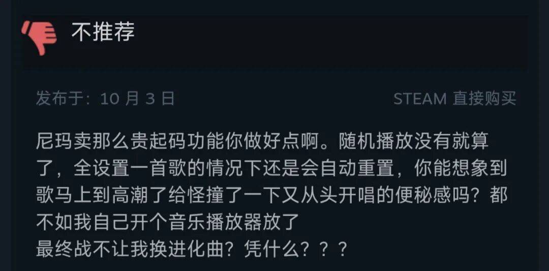 另外,歌曲DLC做得堪称逆天。没有任何片尾曲,进化曲也不全,连OP都不是全的。在这个基础上,甚至无法随机播放,简直是究极噶韭菜,DLC评论区在发售首日就被骂翻天了。