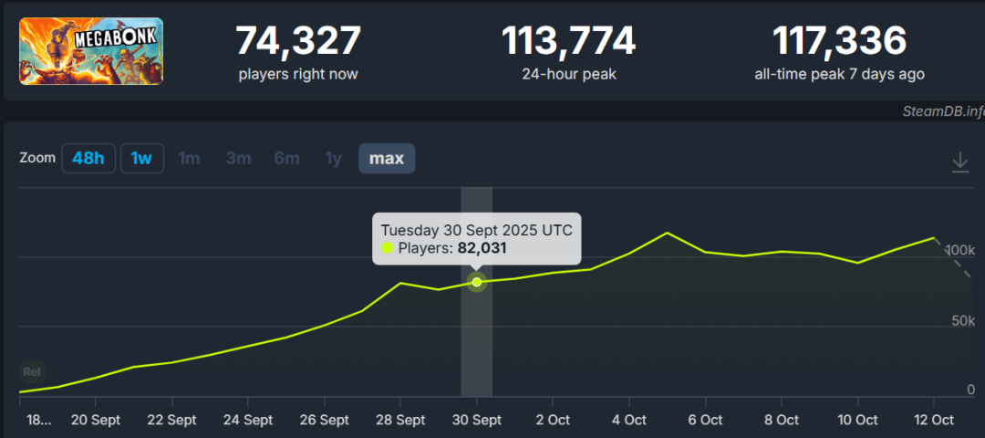 而接下来《Megabonk》的表现出乎了所有人的预料,9月份的后半段,它的同时在线人数几乎每天稳定上涨1万,到30号时已经超过8万。