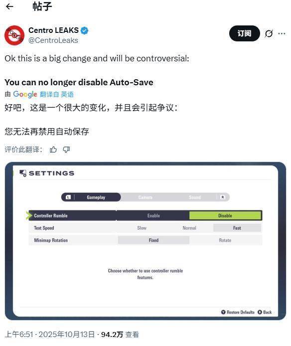 然而,根据宝可梦情报账号Centro在社交平台X上的爆料,《宝可梦传说 Z-A》将取消关闭自动存档的选项。玩家可调整的设置仅限于文字显示速度、小地图旋转方向与手柄震动功能。虽然目前尚不清楚游戏的自动存档频率,但该设计已在社交媒体上引发争议。部分玩家指出,这将严重影响“闪光宝可梦”猎捕流程,也让通过“软重置”来获取理想初始宝可梦属性的方式变得更加困难,因为玩家可能不得不反复创建新的存档文件。