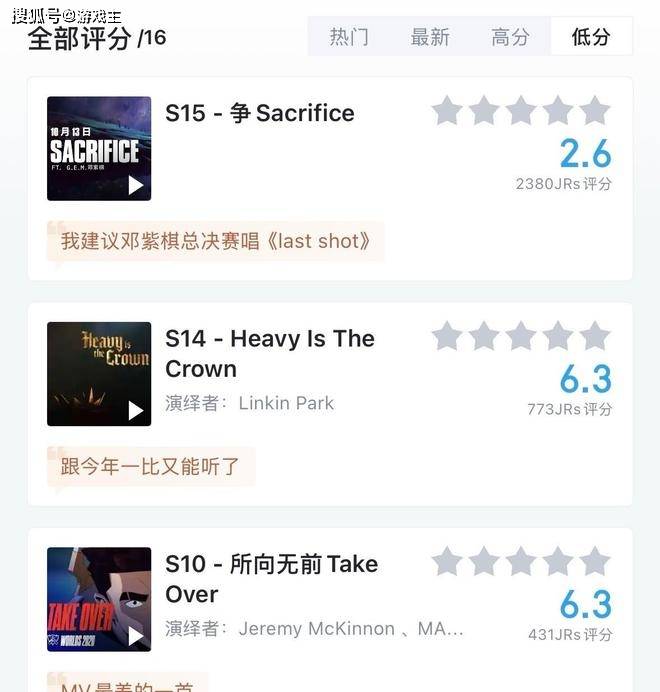 随着比赛即将开始,这一次全球总决赛的主题曲MV也是正式公布了,本来在此之前,总决赛主题曲的热度是非常高的,甚至因为一些选手的问题被迫进行了修改,延迟到比赛前一天才正式上线。结果公布之后,彻底让玩家们失望了,甚至被网友评作是历年以来最差的全球总决赛主题曲。从网友的投票来看,这一次的S15 MV只有2.6的评分,而之前最低的是S14赛季的都有6.3的评分,最高的是当年S7赛季的legends never die,在很多粉丝看来,是满分的存在。