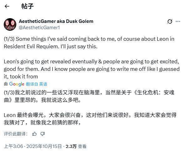 Dusk在社交平台X上表示:“我之前说过的一些话,现在又回到了我这儿——当然,是关于《生化危机9:安魂曲》里的里昂的。我只能这么说,里昂迟早会被正式公开,届时大家都会感到兴奋,那很好。而我也知道,到时候肯定会有人说我只是猜的,或者是从哪里抄来的。”