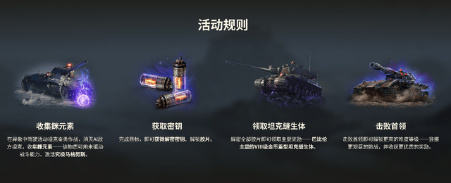 本日开启的米尔内活动是特殊的多人PVE玩法,也是《坦克世界》最近几年都有推出的万圣节年度活动。玩法也非常简单,就是驾驶六台特殊坦克(其中三台需要密钥解锁),完成三层地图的探险,并在第四层迎战BOSS。