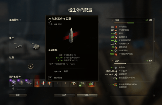 在性能这块,缝生体最突出的特点就是安逸的输出能力。13度俯角加上0.08/0.13/0.13的三扩是很多车一辈子都不敢想的数值。这让它不仅能随便骑坡打人,还有不错的命中率。同时炮弹性能也不错,都是高速AP,光是银币弹就有220毫米穿深和1000m/s的弹速。