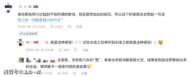 有玩家表示之前听过这首歌,当时觉得歌词有点不知所谓,没想到运用在翁法罗斯的剧情中这么合适,实在太巧合了。这时有玩家提到,很多歌曲只听不看画面的话会显得假大空,故事是赋予歌曲内核的重要因素。