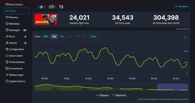 大约一个月前,也就是9月14日,《无主之地4》Steam同时在线峰值达到了30万4398人,成为该系列首发在线最高的一作。然而,一个月左右后,《无主之地4》的24小时在线峰值只有34543人,当前在线24021人。