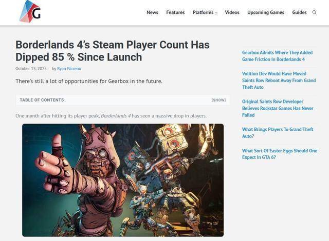 据媒体报道,《无主之地4》仅仅发售一个月后,PC Steam版就已经流失了85%的玩家。