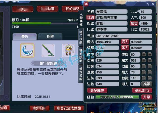 号是59级的神木林,这是没打临时符的面板属性,可以看到只有893的法伤,与那个携带冠军套的魔化生相比,法伤还是稍微有一点低的。不过他的成就竟然高达7603,还是很难得的。