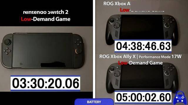 低负载游戏:Switch 2约3.5小时 / Ally X(25W模式)约4.38小时 / Ally X(17W模式)约5.02小时