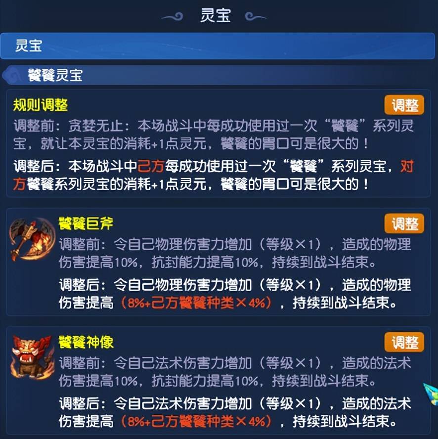 饕餮类灵宝方面效果新增敌我标识,己方每成功使用一次时,对方在使用饕餮灵宝时就要多付出1点灵元。同时,饕餮灵宝还会增加8%+己方饕餮灵宝种类×4%的伤害,非常适合三攻队使用。