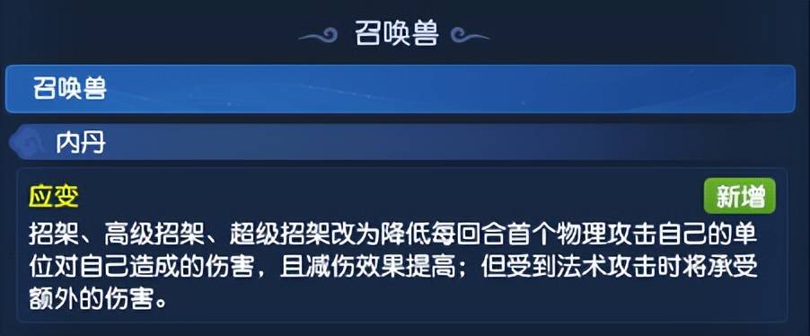 召唤兽内丹方面新增了“应变”,该内丹可以将招架、高级招架、超级招架改为降低每回合首个物理攻击自己的单位对自己造成的伤害,且减伤效果提高,但受到法术攻击时将承受额外伤害。就应用方面来说,该内丹非常克制九黎城、三扫大唐官府、花果山、万寿五庄等门派,属于针对“单核物理”体系的改动。