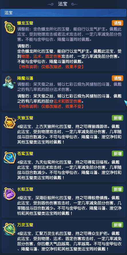 本次新增了【天狼玉璧】、【苍鸾玉璧】、【长鲸玉魄】和【万灵玉璧】等4个四级防御法宝,均不可与金甲仙衣、降斗、澄空净铃和其他玉璧类法宝同时佩戴。其中,【天狼玉璧】可以在受到物理攻击时,一定几率减免部分伤害,几率随着战斗回合数减少;【苍鸾玉璧】可以在受到法术攻击时,一定几率减免部分伤害,几率随着战斗回合数减少;【长鲸玉魄】可以在受到固伤攻击时,一定几率减免部分伤害,几率随着战斗回合数减少。