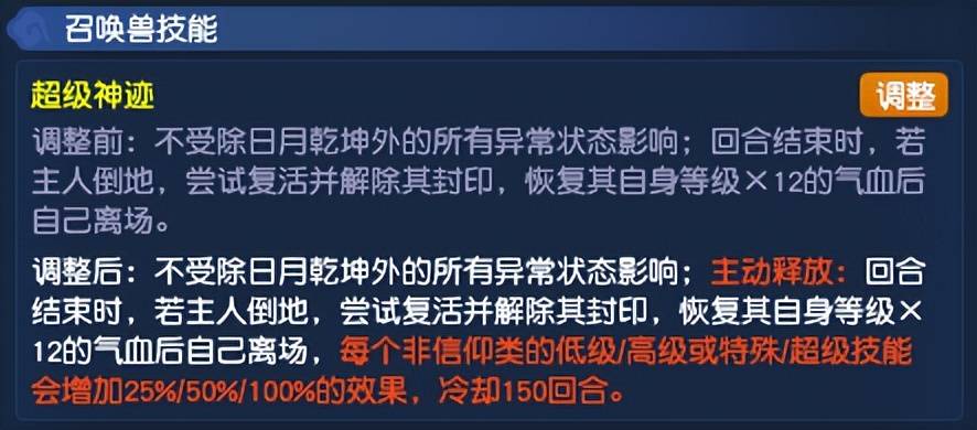 召唤兽技能【超级神迹】调整为主动技能,效果变为回合结束时,若主人倒地,尝试复活并解除其封印,恢复其自身等级X12的气血后自己离场,每个非信仰类的低级高级或特殊超级技能会增加25%/50%/100%的效果,冷却150回合。可以说,调整之后的【超级神迹】的确比之前实用了不少。