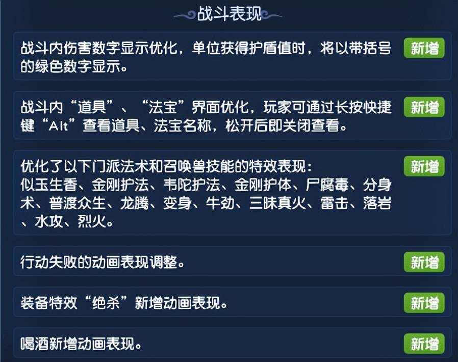 战斗表现方面,新增了各类优化,其中绝杀、喝酒会有全新动画表现。