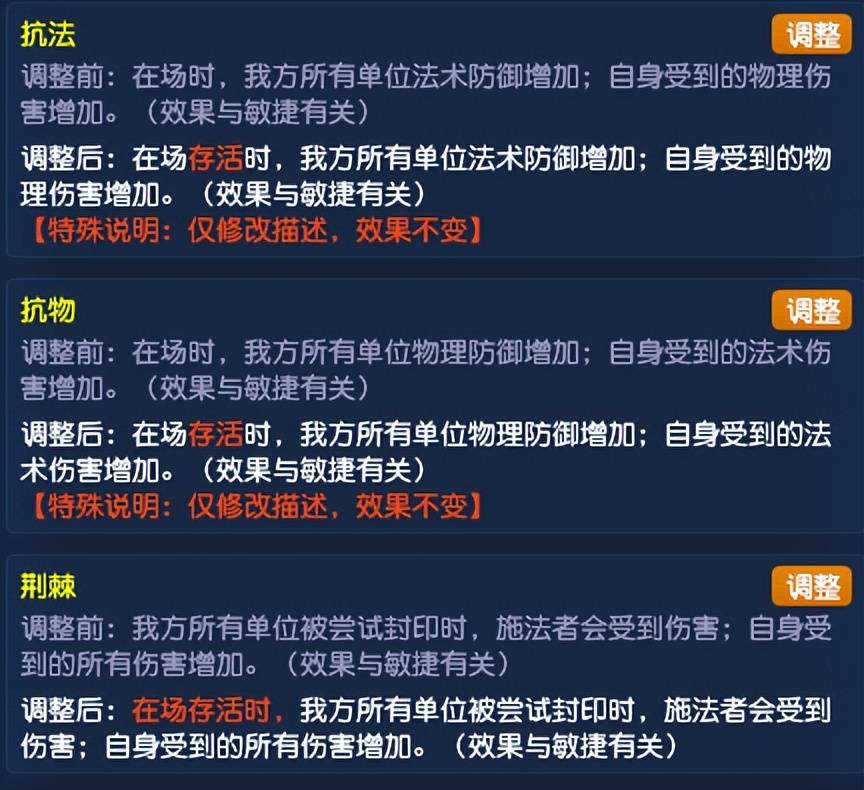 召唤兽抗物、抗法、荆棘只改了描述,将“在场时”变为“在场存活时”。