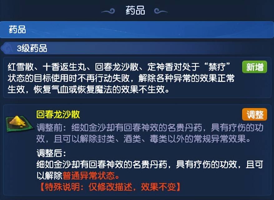 药品系统方面只做了两个调整。一是红雪散、十香返生丸、回春龙沙散、定神香对处于“禁疗”状态的目标使用时不再行动失败,解除各种异常的效果正常生效,恢复气血或恢复魔法的效果不生效。二是提升回春龙沙散的解除普通异常状态的范围,各位小伙伴以后可以多备一些。
